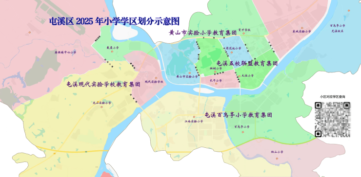 各小学学区范围可参考屯溪区2025年小学学区划分示意图(附件1),查询小区对应学区。