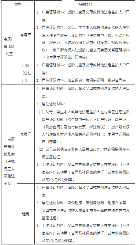 非屯溪区户籍适龄儿童入学,需提供父母在屯溪区稳定居住、工作的证明材料,区教育局将根据父母在屯溪区房产或居住、工作及社保缴纳年限(或完税证明)等情况综合评定,相对就近统筹安排就读学校。
