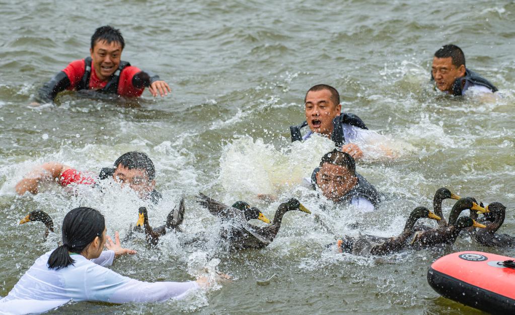 2025年5月31日,四川省乐山市五通桥区龙舟健儿参与“抢鸭子”。当日是端午节,各地群众以多种方式欢度假期。新华社发(孔胜摄)